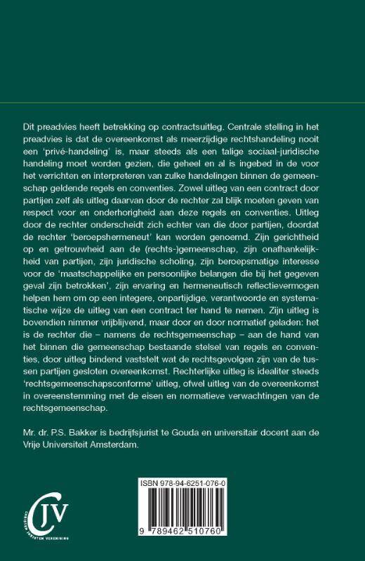 Dit preadvies heeft betrekking op contractsuitleg. Centrale stelling in het preadvies is dat de overeenkomst als meerzijdige rechtshandeling nooit een 'privé-handeling' is, maar steeds als een talige sociaal-juridische handeling moet worden gezien, die geheel en al is ingebed in de voor het verrichten en interpreteren van zulke handelingen binnen de gemeenschap geldende regels en conventies. Zowel uitleg van een contract door partijen zelf als uitleg daarvan door de rechter zal blijk moeten geven van respect voor en onderhorigheid aan deze regels en conventies. Uitleg door de rechter onderscheidt zich echter van die door partijen, doordat de rechter 'beroepshermeneut' kan worden genoemd. Zijn gerichtheid op en getrouwheid aan de (rechts-)gemeenschap, zijn onafhankelijkheid van partijen, zijn juridische scholing, zijn beroepsmatige interesse voor de 'maatschappelijke en persoonlijke belangen die bij het gegeven geval zijn betrokken', zijn ervaring en hermeneutisch reflectievermogen helpen hem om op een integere, onpartijdige, verantwoorde en systematische wijze de uitleg van een contract ter hand te nemen. Zijn uitleg is bovendien nimmer vrijblijvend, maar door en door normatief geladen: het is de rechter die - namens de rechtsgemeenschap - aan de hand van het binnen die gemeenschap bestaande stelsel van regels en conventies, door uitleg bindend vaststelt wat de rechtsgevolgen zijn van de tussen partijen gesloten overeenkomst. Rechterlijke uitleg is idealiter steeds 'rechtsgemeenschapsconforme' uitleg, ofwel uitleg van de overeenkomst in overeenstemming met de eisen en normatieve verwachtingen van de rechtsgemeenschap.