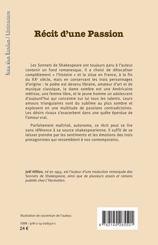 Les Sonnets de Shakespeare ont toujours paru à l’auteur contenir un fond romanesque. Il a choisi de délocaliser complètement « l’histoire » et la situe en France, à la fin du XXe siècle, mais en conservant les trois personnages d’origine : le poète est devenu libraire, amateur d’art et de musique classique, la dame sombre est une Américaine métisse, une femme libre, et le jeune homme un adolescent d’aujourd’hui qui concentre sur lui tous les talents. Leurs amours triangulaires vont du sublime au plus sombre et explosent en une multitude de passions contradictoires. Les désirs rivaux s’exacerbent dans une quête éperdue de l’amour vrai. Parfaitement maîtrisé, autonome, ce récit peut se lire sans référence à sa source shakespearienne. Il suffit de se laisser prendre par les sentiments et les émotions des trois protagonistes qui ressemblent à nos contemporains.