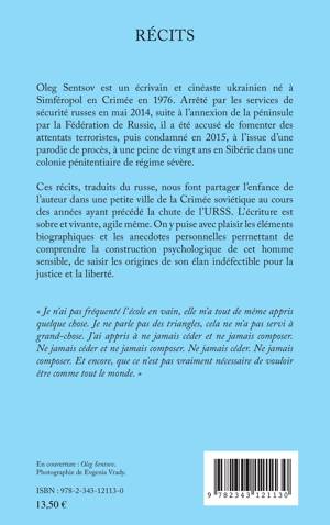 Oleg Sentsov est un écrivain et cinéaste ukrainien arrêté par les services de sécurité russes en mai 2014. Il a été accusé de fomenter des attentats terroristes, puis condamné en 2015 à une peine de vingt ans en Sibérie. Ces récits, traduits du russe, nous font partager l'enfance de l'auteur dans une petite ville de la Crimée soviétique au cours des années ayant précédé la chute de l'URSS. On y puise avec plaisir les éléments biographiques permettant de saisir les origines de l'élan indéfectible pour la justice et la liberté de l'homme sensible qu'il était.