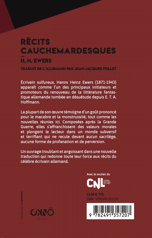 Parmi les "fantastiqueurs" d’expression allemande du début du XXe siècle que l’on découvre ou redécouvre aujourd’hui (Gustav Meyrink, Leo Perutz, Alexander Lernet-Holenia ...), H. H. Ewers est certainement encore le moins connu des lecteurs français. Sans doute en raison de son image d’écrivain à la fois sulfureux (du fait de son esthétique du macabre et de la monstruosité) et idéologiquement suspect (du fait de sa compromission éphémère, fondée sur un profond malentendu, avec le national-socialisme). Si ses grands romans ont été réédités récemment (L’Apprenti sorcier, Mandragore, Vampir), ses nouvelles ne sont encore accessibles qu’au travers de traductions pour la plupart anciennes et incomplètes.<br /> Cette édition offre une nouvelle traduction de 11 nouvelles parmi lesquelles certaines sont inédites en France. <br /> Préface et traduction de Jean-Jacques POLLET <br />