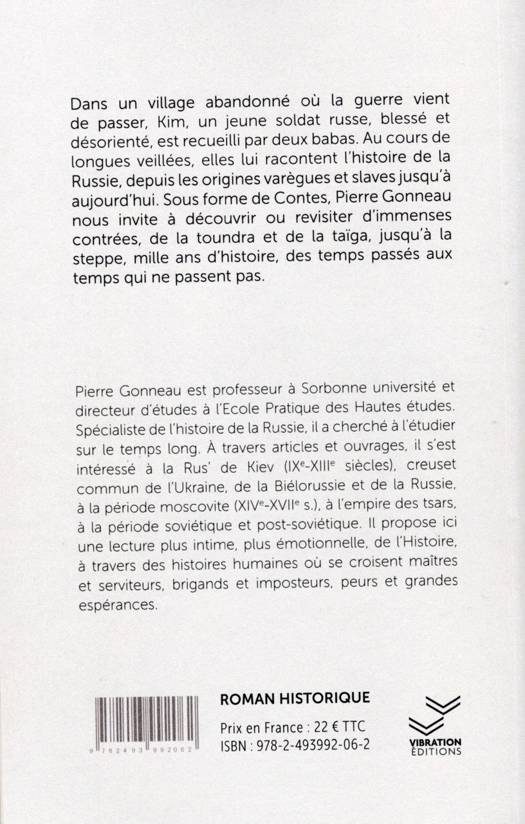 Dans un village abandonné où la guerre vient de passer, Kim, un jeune soldat russe, blessé et désorienté, est recueilli par deux babas. Au cours de longues veillées, elles lui racontent l’histoire de la Russie, depuis les origines varègues et slaves jusqu’à aujourd’hui. Sous forme de Contes, Pierre Gonneau nous invite à découvrir ou revisiter d’immenses contrées, de la toundra et de la taïga, jusqu’à la steppe, mille ans d’histoire, des temps passés aux temps qui ne passent pas.