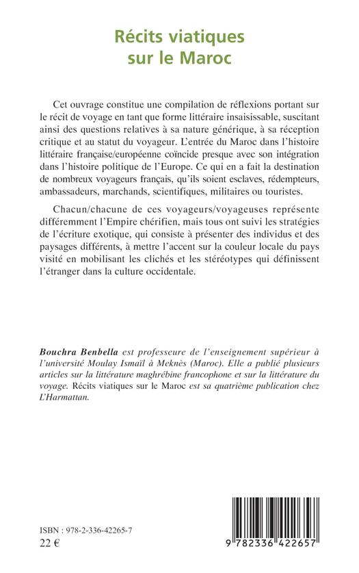 Cet ouvrage constitue une compilation de réflexions portant sur le récit de voyage en tant que forme littéraire insaisissable, suscitant ainsi des questions relatives à sa nature générique, à sa réception critique et au statut du voyageur. L'entrée du Maroc dans l'histoire littéraire française/européenne coïncide presque avec son intégration dans l'histoire politique de l'Europe. Ce qui en a fait la destination de nombreux voyageurs français, qu'ils soient esclaves, rédempteurs, ambassadeurs, marchands, scientifiques, militaires ou touristes. Chacun/chacune de ces voyageurs/voyageuses représente différemment l'Empire chérifien, mais tous ont suivi les stratégies de l'écriture exotique, qui consiste à présenter des individus et des paysages différents, à mettre l'accent sur la couleur locale du pays visité en mobilisant les clichés et les stéréotypes qui définissent l'étranger dans la culture occidentale.
