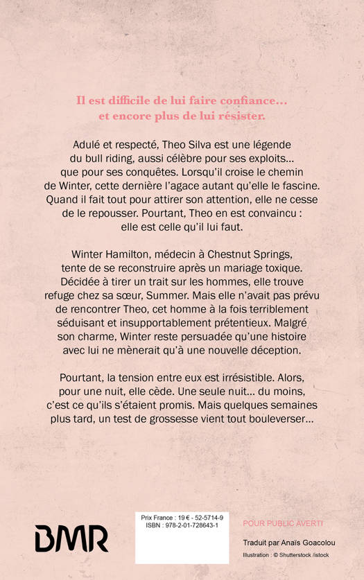 Adulé et respecté, Theo Silva est une légende du bull riding, aussi célèbre pour ses exploits… que pour ses conquêtes. Lorsqu’il croise le chemin de Winter, cette dernière l’agace autant qu’elle le fascine. Quand il fait tout pour attirer son attention, elle ne cesse de le repousser. Pourtant, Theo en est convaincu : elle est celle qu’il lui faut.