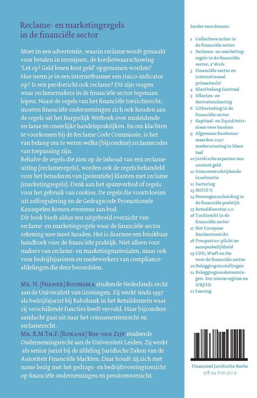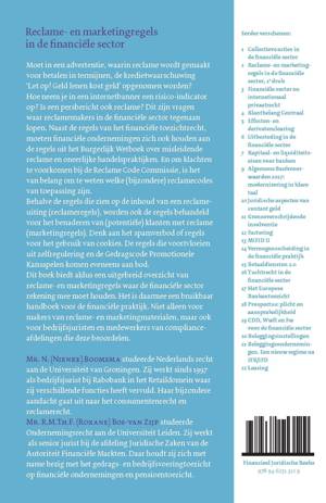 Moet in een advertentie, waarin reclame wordt gemaakt voor betalen in termijnen, de kredietwaarschuwing ‘Let op! Geld lenen kost geld’ opgenomen worden? Hoe neem je in een internetbanner een risico-indicator op? Is een persbericht ook reclame? Dit zijn vragen waar reclamemakers in de financiële sector tegenaan lopen. Naast de regels van het financiële toezichtrecht, moeten financiële ondernemingen zich ook houden aan de regels uit het Burgerlijk Wetboek over misleidende reclame en oneerlijke handelspraktijken. En om klachten te voorkomen bij de Reclame Code Commissie, is het van belang om te weten welke (bijzondere) reclamecodes van toepassing zijn. Behalve de regels die zien op de inhoud van een reclame-uiting (reclameregels), worden ook de regels behandeld voor het benaderen van (potentiële) klanten met reclame (marketingregels). Denk aan het spamverbod of regels voor het gebruik van cookies. De regels die voortvloeien uit zelfregulering en de Gedragscode Promotionele Kansspelen komen eveneens aan bod. Dit boek biedt aldus een uitgebreid overzicht van reclame- en marketingregels waar de financiële sector rekening mee moet houden. Het is daarmee een bruikbaar handboek voor de financiële praktijk. Niet alleen voor makers van reclame- en marketingmaterialen, maar ook voor bedrijfsjuristen en medewerkers van compliance-afdelingen die deze beoordelen.