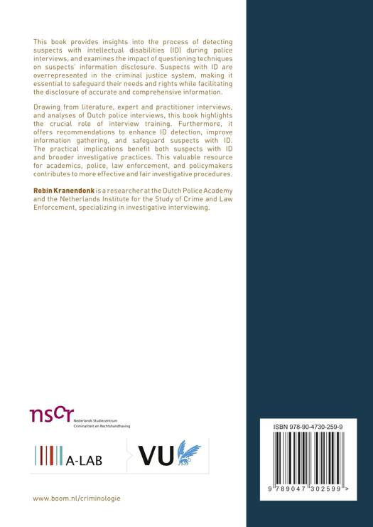 This book provides insights into the process of detecting suspects with intellectual disabilities (ID) during police interviews, and examines the impact of questioning techniques on suspects’ information disclosure. Suspects with ID are overrepresented in the criminal justice system, making it essential to safeguard their needs and rights while facilitating the disclosure of accurate and comprehensive information. Drawing from literature, expert and practitioner interviews, and analyses of Dutch police interviews, this book highlights the crucial role of interview training. Furthermore, it offers recommendations to enhance ID detection, improve information gathering, and safeguard suspects with ID. The practical implications benefi t both suspects with ID and broader investigative practices. This valuable resource for academics, police, law enforcement, and policymakers contributes to more effective and fair investigative procedures. Robin Kranendonk is a researcher at the Dutch Police Academy and the Netherlands Institute for the Study of Crime and Law Enforcement, specializing in investigative interviewing
