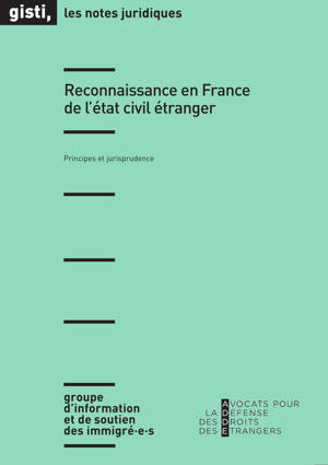 Cette publication, élaborée par le Gisti et l’ADDE, est découpée en deux parties. La première présente de manière synthétique les grands principes de reconnaissance de l’état civil étranger (actes ou jugements étrangers). La seconde rassemble un grand nombre de décisions liées à des questions relatives à l’état civil étranger classées par type de contentieux : demande de visa ou de demande de regroupement familial, preuve de la minorité, transcription ou rectification des actes, jugement déclaratif ou supplétif, nationalité, droit au séjour.