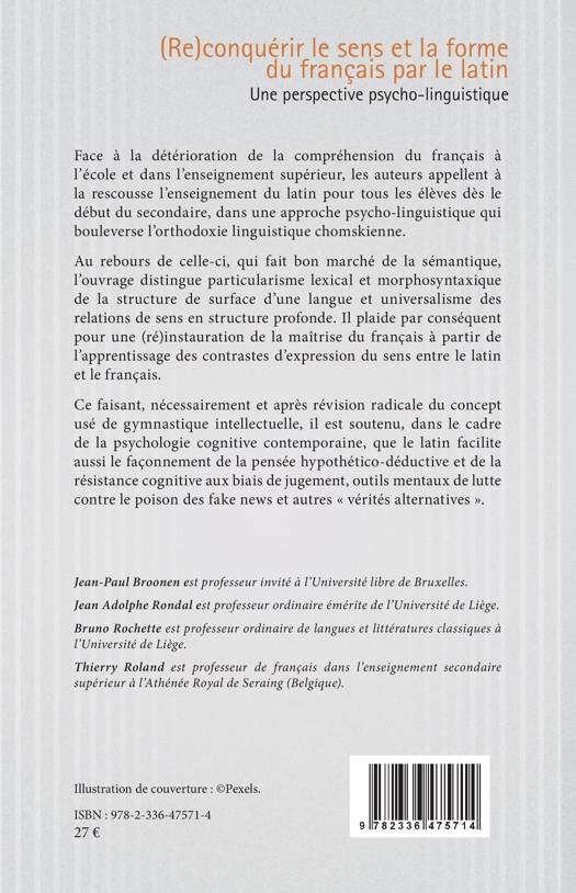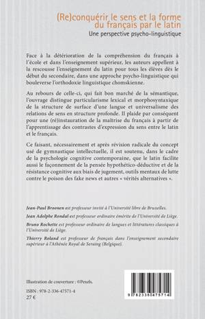 Face à la détérioration de la compréhension du français à l'école et dans l'enseignement supérieur, les auteurs appellent à la rescousse l'enseignement du latin pour tous les élèves dès le début du secondaire, dans une approche psycho-linguistique qui bouleverse l'orthodoxie linguistique chomskienne. Au rebours de celle-ci, qui fait bon marché de la sémantique, l'ouvrage distingue particularisme lexical et morphosyntaxique de la structure de surface d'une langue et universalisme des relations de sens en structure profonde. Il plaide par conséquent pour une (ré)instauration de la maîtrise du français à partir de l'apprentissage des contrastes d'expression du sens entre le latin et le français. Ce faisant, nécessairement et après révision radicale du concept usé de gymnastique intellectuelle, il est soutenu, dans le cadre de la psychologie cognitive contemporaine, que le latin facilite aussi le façonnement de la pensée hypothético-déductive et de la résistance cognitive aux biais de jugement, outils mentaux de lutte contre le poison des fake news et autres vérités alternatives .
