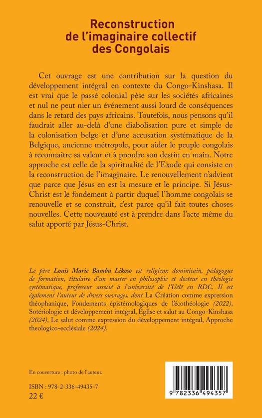 Cet ouvrage est une contribution sur la question du développement intégral en contexte du Congo-Kinshasa. Il est vrai que le passé colonial pèse sur les sociétés africaines et nul ne peut nier un événement aussi lourd de conséquences dans le retard des pays africains. Toutefois, nous pensons qu'il faudrait aller au-delà d'une diabolisation pure et simple de la colonisation belge et d'une accusation systématique de la Belgique, ancienne métropole, pour aider le peuple congolais à reconnaître sa valeur et à prendre son destin en main. Notre approche est celle de la spiritualité de l'Exode qui consiste en la reconstruction de l'imaginaire. Le renouvellement n'advient que parce que Jésus en est la mesure et le principe. Si Jésus-Christ est le fondement à partir duquel l'homme congolais se renouvelle et se construit, c'est parce qu'il fait toutes choses nouvelles. Cette nouveauté est à prendre dans l'acte même du salut apporté par Jésus-Christ.