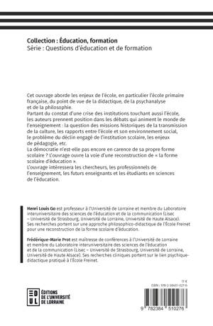 Cet ouvrage aborde les enjeux de l'École, en particulier l'École primaire française, du point de vue de la didactique, de la psychanalyse et de la philosophie. Partant du constat d'une crise des institutions touchant aussi l’École, les auteurs prennent position dans les débats qui animent le monde de l’enseignement : la question des missions historiques de la transmission de la culture, les rapports entre l’École et son environnement social, le problème du déclin engagé de l’institution scolaire, les enjeux de pédagogie, etc.