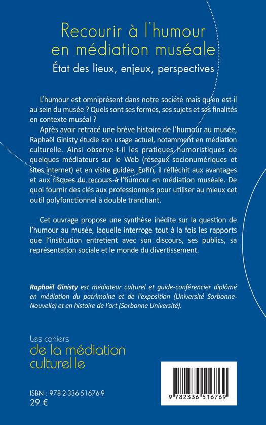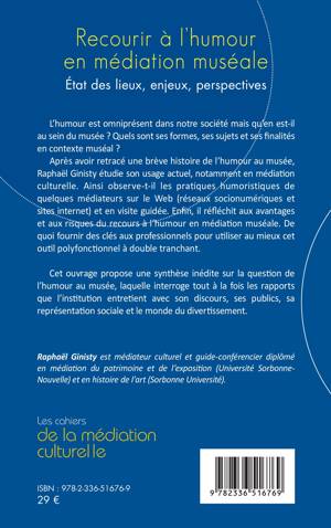 L'humour est omniprésent dans notre société mais qu'en est-il au sein du musée ? Quels sont ses formes, ses sujets et ses finalités en contexte muséal ? Après avoir retracé une brève histoire de l'humour au musée, Raphaël Ginisty étudie son usage actuel, notamment en médiation culturelle. Ainsi observe-t-il les pratiques humoristiques de quelques médiateurs sur le Web (réseaux socionumériques et sites internet) et en visite guidée. Enfin, il réfléchit aux avantages et aux risques du recours à l'humour en médiation muséale. De quoi fournir des clés aux professionnels pour utiliser au mieux cet outil polyfonctionnel à double tranchant. Cet ouvrage propose une synthèse inédite sur la question de l'humour au musée, laquelle interroge tout à la fois les rapports que l'institution entretient avec son discours, ses publics, sa représentation sociale et le monde du divertissement.