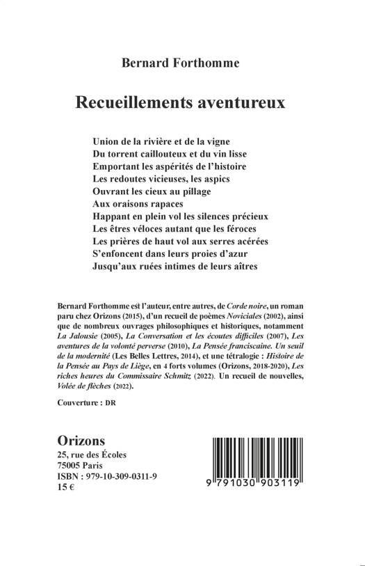 Il nous promène et nous élève, attestant, par son métier d'esthète, le rôle essentiel des bâtisseurs de l'esprit : dire l'homme. [Voir Volée de flèches, sorti en mai 2022]. Mais « la poésie » [est-elle] une tentative incantatoire pour suggérer l'être dans et par la disparition vibratoire du mot ? » (Sartre, Situation III, à propos de Mallarmé). Voyez combien le poème figurant sur la quatrième de couverture de notre recueil suggère les forces de la vie à l'oeuvre ; s'il est incantation dans le choix des mots, c'est que l'Être fait ressortir sa qualité, sa densité, sa ronde, son Temps du « torrent caillouteux » aux « prières de haut vol ».