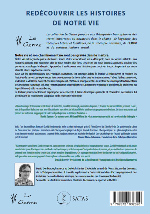 Notre vie est façonnée par les histoires. Si nos récits se focalisent sur le désespoir, nous en sortons affaiblis. Nos histoires peuvent être racontées afin de nous rendre plus forts. Des récits qui nous aident a apaiser la douleur des pertes et a soulager le chagrin. Apprendre à redécouvrir nos histoires peut avoir un impact Important sur notre identité et nos expériences de vie. Basé sur les apprentissages des Pratiques Narratives, cet ouvrage aidera le lecteur à redécouvrir et réécrire les histoires de sa vie. Les expériences liées aux épreuves de la vie telles que les traumatismes, l'abus, l'échec personnel, le deuil et la vieillesse doivent être revendiquées et célébrées. Sont présentés au lecteur des concepts fondamentaux des Pratiques Narratives tels que l'externalisation du problème ("La personne n'est pas le problème, le problème est le problème") et le re-membering. Le lecteur pourra facilement s'approprier ces concepts à l'aide d'exemples parlants et d'exercices accessibles, lui permettant de reconquérir son passé et de redessiner son futur.