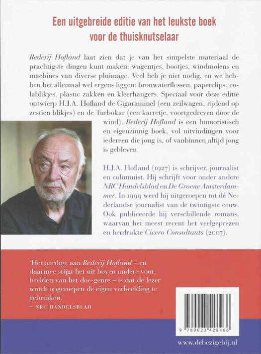 Rederij Hofland laat zien dat je van het simpelste materiaal de prachtigste dingen kunt maken: wagentjes, bootjes, windmolens en machines van diverse pluimage. Veel heb je niet nodig, en we hebben het allemaal wel ergens liggen: bronwaterflessen, paperclips, colablikjes, plastic zakken, kleerhangers, bamboestokjes en ga zo maar door. Speciaal voor deze editie ontwierp H.J.A. Hofland de Gigarammel (een zeilwagen, rijdend op zestien blikjes) en de Turbokar (een karretje, voortgedreven door de wind). Rederij Hofland is een humoristisch en eigenzinnig boek, vol uitvindingen voor iedereen die jong is, of vanbinnen altijd jong is gebleven.