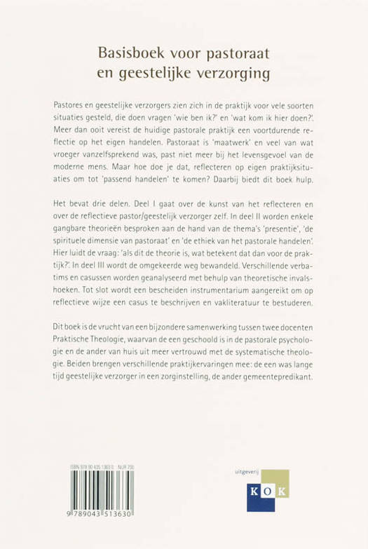 Basisboek voor pastoraat en geestelijke verzorging Pastores en geestelijke verzorgers zien zich in de praktijk voor vele soorten situaties gesteld, die doen vragen 'wie ben ik?' en 'wat kom ik hier doen?' Meer dan ooit vereist de huidige pastorale praktijk een voortdurende reflectie op het eigen handelen. Pastoraat is 'maatwerk' en veel van wat vroeger vanzelfsprekend was, past niet meer bij het levengevoel van de moderne mens. Maar hoe doe je dat, reflecteren op eigen praktijksituaties om tot 'passend handelen' te komen? Daarbij biedt dit boek hulp. Het bevat drie delen. Deel I gaat over de kunst van het reflecteren en over de reflectieve pastor/geestelijk verzorger zelf. In deel II worden enkele gangbare theorieën besproken aan de hand van de thema's 'presentie', 'de spirituele dimensie van pastoraat' en 'de ethiek van het pastorale handelen' Hier luidt de vraag:'als dit de theorie is, wat betekent dat dan voor de praktijk?'.In deel III wordt de omgekeerde weg bewandeld. Verschillende verbatims en casussen worden geanalyseerd met behulp van theoretische invalshoeken. Tot slot wordt een bescheiden instrumentarium aangereikt om op reflectieve wijze een casus te beschrijven en vakliteratuur te bestuderen. Dit boek is de vrucht van een bijzondere samenwerking tussen twee docenten Praktische Theologie, waarvan de een geschoold is in de pastorale psychologie en de ander van huis uit meer vertrouwd met de systematische theologie. Beiden brengen verschillende praktijkervaringen mee:de een was lange tijd geestelijke verzorger in een zorginstelling, de ander gemeentepredikant.