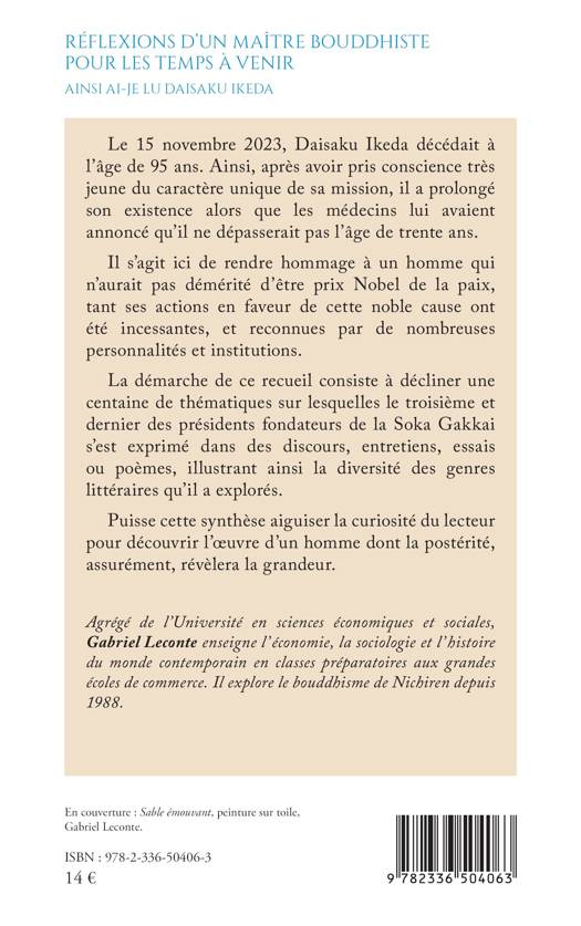 Le 15 novembre 2023, Daisaku Ikeda décédait à l’âge de 95 ans. Ainsi, après avoir pris conscience très jeune du caractère unique de sa mission, il a prolongé son existence alors que les médecins lui avaient annoncé qu’il ne dépasserait pas l’âge de trente ans. Il s’agit ici de rendre hommage à un homme qui n’aurait pas démérité d’être prix Nobel de la paix, tant ses actions en faveur de cette noble cause ont été incessantes, et reconnues par de nombreuses personnalités et institutions. La démarche de ce recueil consiste à décliner une centaine de thématiques sur lesquelles le troisième et dernier des présidents fondateurs de la Soka Gakkai s’est exprimé dans des discours, entretiens, essais ou poèmes, illustrant ainsi la diversité des genres littéraires qu’il a explorés. Puisse cette synthèse aiguiser la curiosité du lecteur pour découvrir l’œuvre d’un homme dont la postérité, assurément, révèlera la grandeur.