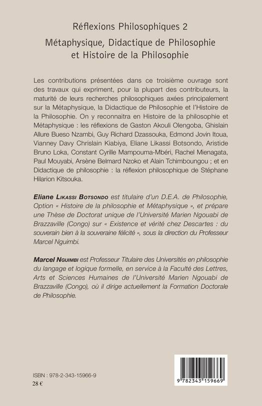 Les contributions présentées sont axées principalement sur la Métaphysique, la Didactique de Philosophie et l'Histoire de la Philosophie. On y reconnaitra en Histoire de la philosophie et Métaphysique : les réflexions de Gaston Akouli Olengoba, Ghislain Allure Bueso Nzambi, Guy Richard Dzassouka, Edmond Jovin Itoua, Vianney Davy Chrislain Kiabiya, Eliane Likassi Botsondo, Aristide Bruno Loka, Constant Cyrille Mampouma-Mbéri, Rachel Mienagata, Paul Mouyabi, Arsène Belmard Nzoko et Alain Tchimboungou ; et en Didactique de philosophie : la réflexion philosophique de Stéphane Hilarion Kitsouka.