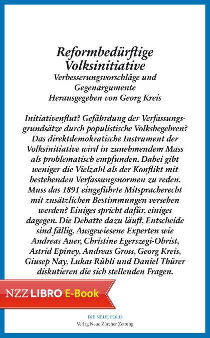 Muss das 1891 eingeführte Mitspracherecht des Volkes mit zusätzlichen Bestimmungen versehen werden? Sind die Verfassungsgrundsätze durch populistische Volksbegehren gefährdet? Seit einiger Zeit wird in öffentlichen Diskussionen eine Revision des Initiativrechts gefordert und es werden Massnahmen erörtert, die der Vielzahl der Volksinitiativen entgegenwirken und insbesondere die Konflikte mit bestehenden Verfassungsbestimmungen vermeiden. Auch die Staatspolitische Kommission des Ständerats hat sich eingehend mit dem heissen Eisen befasst und im August 2015 fünf Reformvorschläge unterbreitet. Der aktuelle Band in der Reihe «Die neue Polis» umfasst acht Beiträge, in denen ausgewiesene Experten und Expertinnen aus historischer, politischer und vor allem aus juristischer Sicht die sich stellenden Fragen diskutieren.