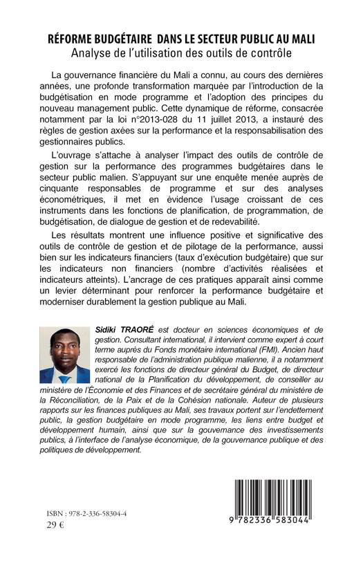 La gouvernance financière du Mali a connu, au cours des dernières années, une profonde transformation marquée par l'introduction de la budgétisation en mode programme et l'adoption des principes du nouveau management public. Cette dynamique de réforme, consacrée notamment par la loi n°2013-028 du 11 juillet 2013, a instauré des règles de gestion axées sur la performance et la responsabilisation des gestionnaires publics. L'ouvrage s'attache à analyser l'impact des outils de contrôle de gestion sur la performance des programmes budgétaires dans le secteur public malien. S'appuyant sur une enquête menée auprès de cinquante responsables de programme et sur des analyses économétriques, il met en évidence l'usage croissant de ces instruments dans les fonctions de planification, de programmation, de budgétisation, de dialogue de gestion et de redevabilité. Les résultats montrent une influence positive et significative des outils de contrôle de gestion et de pilotage de la performance, aussi bien sur les indicateurs financiers (taux d'exécution budgétaire) que sur les indicateurs non financiers (nombre d'activités réalisées et indicateurs atteints). L'ancrage de ces pratiques apparaît ainsi comme un levier déterminant pour renforcer la performance budgétaire et moderniser durablement la gestion publique au Mali.