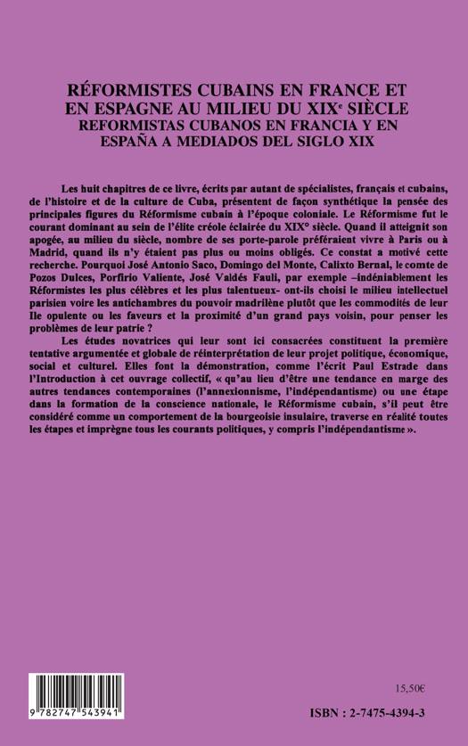 Les huit chapitres de ce livre, écrits par autant de spécialistes, français et cubains, de l'histoire et de la culture de Cuba, présentent de façon synthétique la pensée des principales figures du Réformisme cubain à l'époque coloniale. Le Réformisme fut le courant dominant au sein de l'élite créole éclairée du XIXème siècle. Quand il atteignit son apogée, au milieu du siècle, nombre de ses porte-parole préféraient vivre à Paris ou à Madrid, quand ils n'y étaient pas plus ou moins obligés. Les études novatrices qui leur sont ici consacrées constituent la première tentative argumentée et globale de réinterprétation de leur projet politique, économique, social et culturel.