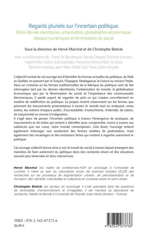 Cet ouvrage identifie les formes actuelles du politique, du Mali au Québec en passant par la Turquie, l'Espagne, Madagascar, la France ou encore l'Italie. Que se passe-t-il concrètement en matière de redéfinition du politique ? Quelles formes prennent les mouvements protestataires à travers le monde ? Les notions d'espace public, d'autochtonie, d'identité, de nation, de citoyenneté sont, entre autres, analysées. L'incertain politique est pensé à travers des pratiques, mouvements et luttes qui restent à identifier pour comprendre notre monde contemporain.