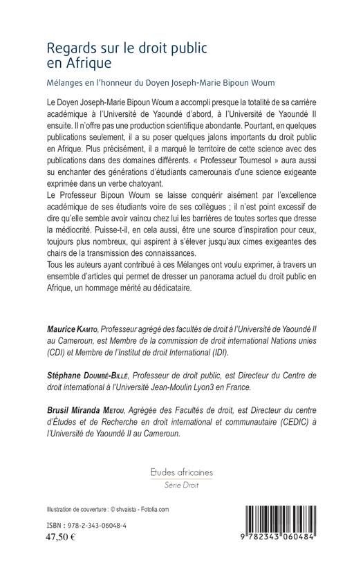 Le Doyen Joseph-Marie Bipoun Woum a, en quelques publications seulement, su poser quelques jalons importants du droit public en Afrique. Il a marqué le territoire de cette science et aura su enchanter des générations d'étudiants camerounais. Tous les auteurs ayant contribué à ces Mélanges ont voulu exprimer, à travers un ensemble d'articles qui permet de dresser un panorama actuel du droit public en Afrique, un hommage mérité au dédicataire.