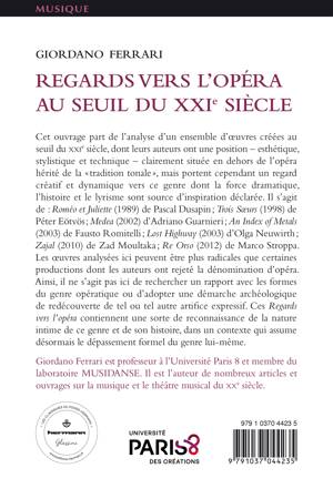 Cet ouvrage part de l’analyse d’un ensemble d’œuvres créées au seuil du XXIe siècle, dont leurs auteurs ont une position – esthétique, stylistique et technique – clairement située en dehors de l’opéra hérité de la « tradition tonale », mais portent cependant un regard créatif et dynamique vers ce genre dont la force dramatique, l’histoire et le lyrisme sont source d’inspiration déclarée. Il s’agit de : Roméo et Juliette (1989) de Pascal Dusapin ; Trois Sœurs (1998) de Péter Eötvös ; Medea (2002) d’Adriano Guarnieri ; An Index of Metals (2003) de Fausto Romitelli ; LostHighway (2003) d’Olga Neuwirth ; Zajal (2010) de Zad Moultaka ; Re Orso (2012) de Marco Stroppa. Les œuvres analysées ici peuvent être plus radicales que certaines productions dont les auteurs ont rejeté la dénomination d’opéra. Ainsi, il ne s’agit pas de rechercher un rapport avec les formes du genre opératique ou d’adopter une démarche archéologique de redécouverte de tel ou tel autre artifice expressif. Ces Regards vers l’opéra contiennent une sorte de reconnaissance de la nature intime de ce genre et de son histoire, dans un contexte qui assume désormais le dépassement formel du genre lui-même.