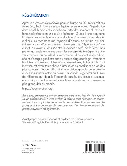 Après le succès de Drawdown, paru en France en 2018 aux éditions Actes Sud, Paul Hawken et son équipe reviennent avec Régénération dans lequel ils précisent leur ambition : atteindre l'inversion du réchauffement planétaire en une seule génération. Grâce à une approche transversale originale et à la mobilisation d'un vaste champ de disciplines, ils recensent une myriade d'actions de terrain qui participent toutes d'un mouvement émergent de "régénération" du climat, du vivant et des sociétés humaines ; bref, de la Terre. Des projets qui explorent, entres autres, les concepts de biorégion, de ville zéro carbone ou de ville du quart d'heure, d'architecture décarbonnée et d'énergie géothermique ou encore d'agroécologie. Associant les luttes sociales aux luttes environnementales, l'objectif de Paul Hawken est avant toute chose d'améliorer les conditions de vie des plus démunis. L'auteur offre ainsi une vision globale du problème et des solutions à mettre en oeuvre, faisant de Régénération LE livre de référence qui détaille l'ensemble des leviers culturels, sociaux, économiques, techniques et scientifiques à solliciter pour relever le plus grand défi au monde.