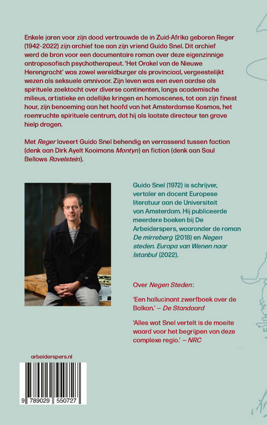 Enkele jaren voor zijn dood vertrouwde de in Zuid-Afrika geboren Reger (1942-2022) zijn archief toe aan zijn vriend Guido Snel. Dit archief werd de bron voor een documentaire roman over deze eigenzinnige antroposofisch psychotherapeut. ‘Het Orakel van de Nieuwe Herengracht’ was zowel wereldburger als provinciaal, vergeestelijkt wezen als seksuele omnivoor. Zijn leven was een even aardse als spirituele zoektocht over diverse continenten, langs academische milieus, artistieke en adellijke kringen en homoscenes, tot aan zijn finest hour, zijn benoeming aan het hoofd van het Amsterdamse Kosmos, het roemruchte spirituele centrum, dat hij als laatste directeur ten grave hielp dragen.