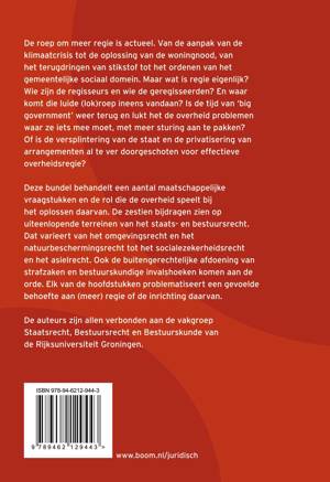 De roep om meer regie is actueel. Van de aanpak van de klimaatcrisis tot de oplossing van de woningnood, van het terugdringen van stikstof tot het ordenen van het gemeentelijke sociaal domein. Maar wat is regie eigenlijk? Wie zijn de regisseurs en wie de geregisseerden? En waar komt die luide (lok)roep ineens vandaan? Is de tijd van ‘big government’ weer terug en lukt het de overheid problemen waar ze iets mee moet, met meer sturing aan te pakken? Of is de versplintering van de staat en de privatisering van arrangementen al te ver doorgeschoten voor effectieve overheidsregie? Deze bundel behandelt een aantal maatschappelijke vraagstukken en de rol die de overheid speelt bij het oplossen daarvan. De zestien bijdragen zien op uiteenlopende terreinen van het staats- en bestuursrecht. Dat varieert van het omgevingsrecht en het natuurbeschermingsrecht tot het socialezekerheidsrecht en het asielrecht. Ook de buitengerechtelijke afdoening van strafzaken en bestuurskundige invalshoeken komen aan de orde. Elk van de hoofdstukken problematiseert een gevoelde behoefte aan (meer) regie of de inrichting daarvan. De auteurs zijn allen verbonden aan de vakgroep Staatsrecht, Bestuursrecht en Bestuurskunde van de Rijksuniversiteit Groningen.