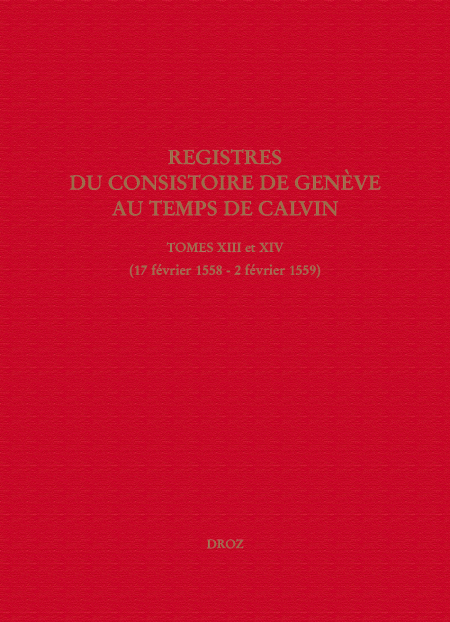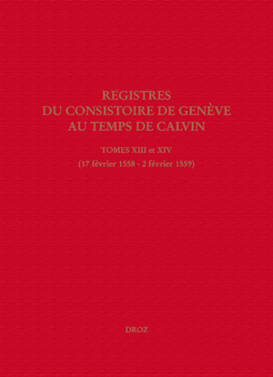 Publiés en un seul volume, les tomes XIII et XIV des Registres du Consistoire de Genève couvrent l’année 1558 et le début de 1559. Ces registres illustrent le fort rôle pédagogique du Consistoire et l’intensification de ses efforts pour combattre l’ignorance religieuse, qui augmente avec l’arrivée de nombreux réfugiés, connaissant mal les principes de base de la foi réformée. Le Consistoire comme le Conseil se montrent plus sévères à l’égard des gens qui retournent à Genève après avoir renié leur foi en terre catholique, même sous menace de mort. Calvin et ses collègues se préoccupent de plus en plus des biens dilapidés dans les produits de luxe et, pour la première fois, ils convoquent des personnes pour gourmandise. De la même façon, les autorités prêtent davantage attention aux activités sportives et aux jeux de hasard, qui détournent les jeunes du catéchisme.