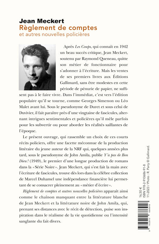 Après Les Coups, qui connaît un succès critique et public, Jean Meckert, soutenu par Raymond Queneau, quitte son métier de fonctionnaire pour se consacrer entièrement à l’écriture. Sous les pseudonymes de Duret ou Duvivier, il fait paraître une vingtaine de fascicules policiers ou sentimentaux. Le présent ouvrage rassemble les récits policiers offrant une facette méconnue de la production littéraire du jeune auteur de la NRF qui, quelques années plus tard, publiera, sous le pseudonyme de John Amila, Y’a pas de Bon Dieuâ! à la «âSérie Noireâ», le premier d’une longue série de romans noirs dont Didier Daeninckx et Patrick Pécherot revendiqueront l’influence. Règlement de comptes et autres nouvelles policières apparaît ainsi comme le lien entre la littérature blanche de Jean Meckert et la littérature noire de John Amila, l’auteur prenant ses distances avec le récit de détection pour puiser son inspiration dans le réalisme de la vie quotidienne ou l’intensité sanglante du fait divers.