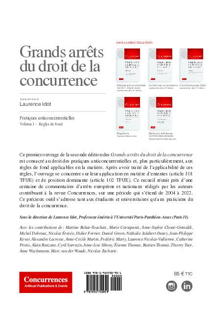 Ce premier ouvrage de la seconde édition des Grands arrêts du droit de la concurrence est consacré au droit des pratiques anticoncurrentielles et, plus particulièrement, aux règles de fond applicables en la matière. Après avoir traité de l'applicabilité de ces règles, l'ouvrage se concentre sur leur application en matière d'ententes (article 101 TFUE) et de position dominante (article 102 TFUE). Ce recueil réunit près d'une centaine de commentaires d'arrêts européens et nationaux rédigés par les auteurs contribuant à la revue Concurrences, sur une période qui s'étend de 2004 à 2022. Ce précieux outil s'adresse tant aux étudiants et universitaires qu'aux praticiens du droit de la concurrence.