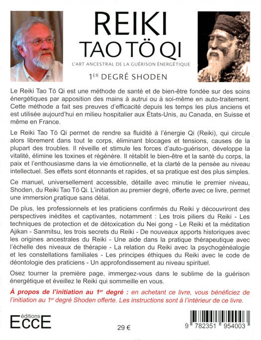 Le Reiki Tao Tö Qi est une méthode de santé bien-être fondée sur des soins énergétiques par apposition des mains à autrui, ou à soi-même en auto-traitement. Cette méthode a fait ses preuves d'efficacité depuis les temps les plus anciens, et est utilisé aujourd'hui en milieu hospitalier aux États-Unis, au Canada, en Suisse et même en France. Le Reiki Tao Tö Qi permet de rendre sa fluidité à l'énergie Qi (Reiki) qui circule alors librement dans tout le corps, éliminant blocages et tensions qui sont la cause de la plupart des troubles. Il réveille et stimule les forces d'auto-guérison, développe la vitalité, élimine les toxines et régénère. Il rétablit le bien-être et la santé du corps, la paix et l'enthousiasme dans la vie émotionnelle, et la clarté de la pensée au niveau intellectuel. Ses effets sont étonnants et rapides, et sa pratique est des plus simples. Ce manuel, universellement accessible, détaille avec minutie le premier niveau, Shoden, du Reiki Tao Tö Qi. L'inclusion d'un QR Code d'initiation au premier degré facilite une immersion pratique sans délai.