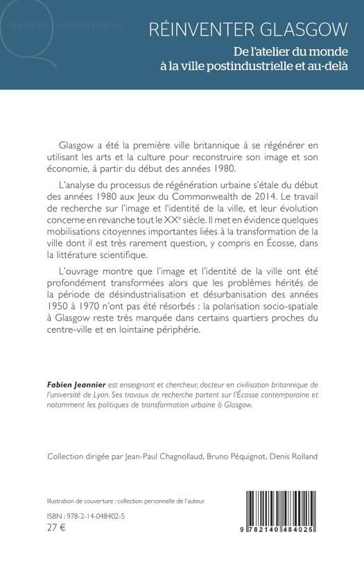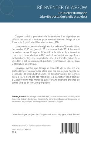 Glasgow a été la première ville britannique à se régénérer en utilisant les arts et la culture pour reconstruire son image et son économie, à partir du début des années 1980. L'analyse du processus de régénération urbaine s'étale du début des années 1980 aux Jeux du Commonwealth de 2014. Le travail de recherche sur l'image et l'identité de la ville, et leur évolution concerne en revanche tout le XXe siècle. Il met en évidence quelques mobilisations citoyennes importantes liées à la transformation de la ville dont il est très rarement question, y compris en Écosse, dans la littérature scientifique. L'ouvrage montre que l'image et l'identité de la ville ont été profondément transformées alors que les problèmes hérités de la période de désindustrialisation et désurbanisation des années 1950 à 1970 n'ont pas été résorbés : la polarisation socio-spatiale à Glasgow reste très marquée dans certains quartiers proches du centre-ville et en lointaine périphérie.