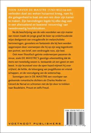 XAVIER DE MAISTRE: REIS DOOR MIJN KAMER, vertaling uit het Frans en nawoord: Paul de Bruin. Toen Xavier de Maistre [1763-1852] na een verboden duel zes weken huisarrest kreeg en zijn huis niet mocht verlaten, laat staan reizen, besloot hij een reis door zijn kamer te maken. Zijn bevindingen legde hij elke dag vast, in 42 hoofdstukken [6 weken van 7 dagen = 42 dagen]. Na de beschrijving van de vele voordelen van zijn manier van reizen maakt hij de lezer op onderhoudende wijze deelgenoot van vreugdevolle en melancholieke herinneringen, gevoelens en fantasieën die bij hem worden opgeroepen door wat hij op zijn reis tegenkomt. Ook meer filosofisch getinte onderwerpen passeren de revue. In zijn leunstoel voor de open haard mijmert hij over vrijheid, liefde, de teloorgang van jeugdillusies en vriendschappen. Als na 42 dagen zijn huisarrest voorbij is, eindigt hij zijn verslag met de verzuchting: 'Vandaag ben ik dus vrij of laat ik mij, liever gezegd, weer aan banden leggen! Het juk der dagelijkse beslommeringen zal opnieuw op mij drukken...'