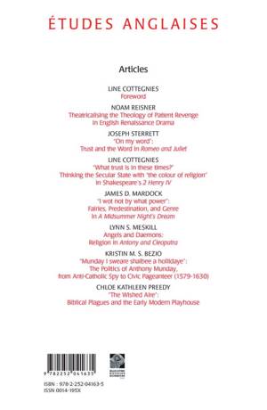 Un dossier consacré à la place de la religion dans l'art dramatique anglais, notamment dans l'oeuvre de Shakespeare et dans le théâtre élisabéthain. Les contributeurs mettent aussi en évidence la manière dont les textes peuvent refléter la situation religieuse de l'époque.