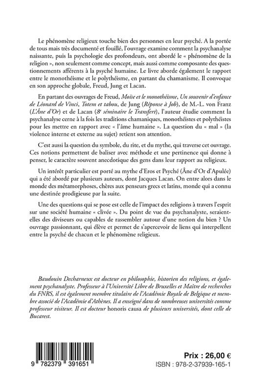 Il s'agit d'un ouvrage à la portée de tous, via une approche fine et précieuse, très documentée, fouillée. Dès leurs origines, la psychanalyse et la psychologie des profondeurs se sont intéressées au phénomène religieux. Cet ouvrage examine cette approche innovante de la psyché humaine. L’exploration d’un continent assez inconnu, celui des liens entre la religion et ses effets sur l’esprit ou l’âme, à partir des théories de Freud, Jung et Lacan. L’ouvrage aborde également le rapport entre monothéisme et polythéisme, à partir du chamanisme. L’ouvrage de Baudouin Decharneux présente un triple intérêt. Celui d’une approche pertinente en ce qui concerne l’impact des religions d’un point de vue global sur la psyché humaine. Celui d’un examen qui intéresse toute personne qui s’interroge, qu’elle soit croyante ou non, dans le souci de rassembler ce qui est épars, et à défaut, de souligner l’explication qui ne le permettrait pas. Et enfin, celui de prendre de la hauteur, tout en demeurant accessible à tous, sur un point non négligeable, le rôle de la psychanalyse en matière de perception religieuse. En partant des ouvrages de Freud, "Moïse et le monothéisme, Un souvenir d’enfance de Léonard de Vinci, Totem et tabou", de Jung, "Réponse à Job", de M.-L. von Franz, "l’Âne d’Or", et, de Lacan, "8e séminaire le Transfert", l’auteur étudie comment la psychanalyse cerne à la fois les traditions monothéistes et polythéistes pour les mettre en rapport avec « l’âme humaine ». La question du mal (la violence interne et externe au sujet) retient l'attention de l'auteur, de même que la question des « associations libres ». Un intérêt particulier est porté au mythe d’Erôs et Psyché. Une des questions qui se pose est celle de l’impact des religions à travers l’esprit sur une société humaine « clivée », du point de vue du psychanalyste. Baudouin Decharneux est docteur en philosophie, historien des religions, et également psychanalyste. Professeur à l’Université Libre de Bruxelles et Maître de recherches du FNRS, il est également membre titulaire de l’Académie Royale de Belgique et membre associé de l’Académie d’Athènes. Il a enseigné dans de nombreuses universités comme professeur visiteur. Il est docteur honoris causa de plusieurs universités, dont celle de Bucarest. Points forts de l'ouvrage : Religion – Spiritualité – Psyché – Psychanalyse – Psychologie des profondeurs – Monothéisme – Polythéisme - Intériorité - clivages.