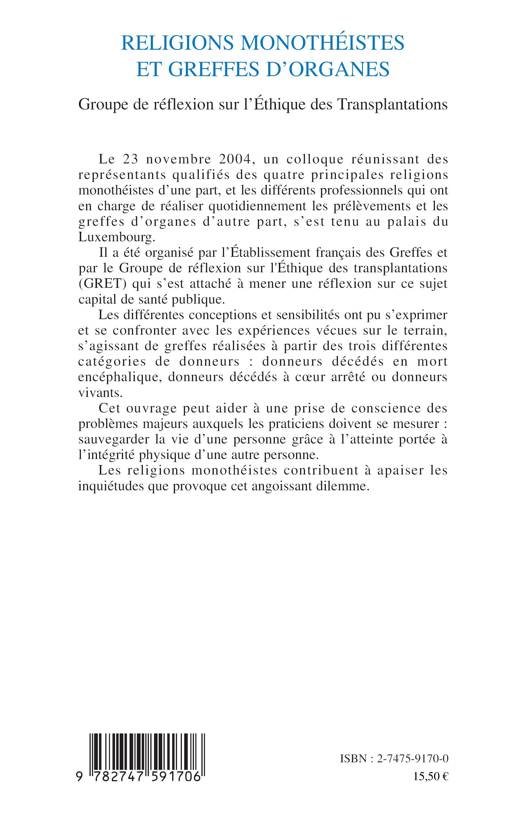 Réunissant des représentants qualifiés des quatre principales religions monothéistes et des professionnels qui ont en charge de réaliser quotidiennement les prélèvements et les greffes d'organes, ce colloque s'est attaché à réfléchir sur ce sujet capital de santé publique. Différentes sensibilités se sont confrontées avec les expériences vécues sur le terrain à partir de différentes catégories de donneurs : donneurs décédés en mort encéphalique, donneurs décédés à coeur arrêtés, donneurs vivants. Comment sauvegarder la vie d'une personne grace à l'atteinte portée à l'intégrité physique d'une autre personne ?