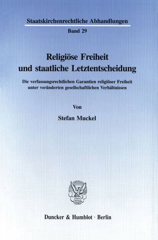 Der religiose und weltanschauliche Pluralismus, der sich in den vergangenen Jahrzehnten in Deutschland zu bilden begonnen hat, macht staatliches Handeln erforderlich. Der Staat muss anders als noch vor wenigen Jahrzehnten gegenuber Interessen, die als religios fundiert bezeichnet werden, Gemeinwohlbelange durchsetzen. Die Notwendigkeit hierzu wird vor allem belegt durch die Aktivitaten der mitunter als Jugendsekten apostrophierten neuartigen (pseudo-)religiosen oder weltanschaulichen Gemeinschaften und die vielfatigen Gefahren, die von ihnen ausgehen. Das Grundgesetz schutzt Religion und Weltanschauung, bietet aber zugleich den staatlichen Stellen hinreichende Moglichkeiten, ihre Gemeinwohlverantwortung auch in Angelegenheiten mit religiosem oder weltanschaulichem Bezug wahrzunehmen. Die Verfassung weist dem Staat das Letztentscheidungsrecht zu. Es aussert sich auf der Ebene des Schutzbereichs der einzelnen verfassungsrechtlichen Gewahrleistungen darin, dass der Staat fur die fraglichen Rechtsbegriffe die Definitionsmacht inne hat. Soweit der Schutzbereich eines Freiheitsrechts betroffen ist, uben die staatlichen Stellen ihr Letztentscheidungsrecht aus, indem sie von den jeweiligen Gewahrleistungsschranken Gebrauch machen. Die vom Grundgesetz geformte Verfassungsordnung lasst der Religion und den Religionsgemeinschaften weitreichende Freiraume zur Entfaltung in allen Bereichen des Lebens, erlaubt aber zugleich, bestimmten als gemeinwohlschadlich erkannten Aktivitaten wirkungsvoll entgegenzutreten.