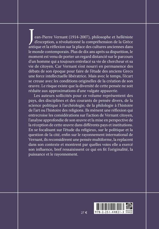 Jean-Pierre Vernant (1914-2007), philosophe et helleniste d'exception, a revolutionne la comprehension de la Grece antique et la reflexion sur la place des cultures anciennes dans le monde contemporain. Plus de dix ans apres sa disparition, le moment est venu de porter un regard distancie sur le parcours d'un homme qui a toujours entrelace sa vie de chercheur et sa vie de citoyen. Car Vernant s'est nourri en permanence des debats de son epoque pour faire de l'etude des anciens Grecs une force intellectuelle liberatrice. Mais avec le temps, l'ecart se creuse avec les conditions originelles de la creation de son oeuvre. Le risque existe que la diversite de cette pensee ne soit reduite aux approximations d'une vulgate appauvrie.Les auteurs sollicites pour ce volume representent des pays, des disciplines et des courants de pensee divers, de la science politique a l'archeologie, de la philologie a l'histoire de l'art ou l'histoire des religions. Ils menent une reflexion qui entrecroise les considerations sur l'action de Vernant citoyen, l'analyse approfondie de son oeuvre et la mise en perspective de la reception de cette oeuvre dans differents pays et institutions.En se focalisant sur l'etude du religieux, sur le politique et la question de la cite, enfin sur le rayonnement international de Vernant, ils reconsiderent une pensee multiforme, la replacent dans son contexte et montrent par quelles voies elle a exerce son influence, bref ressaisissent ce qui en fit l'originalite, la puissance et le rayonnement.