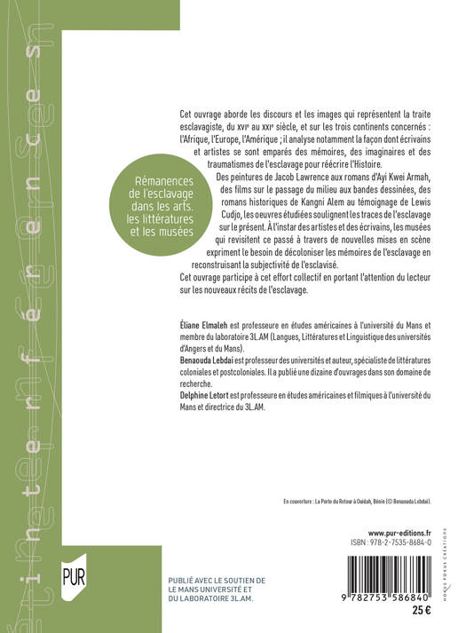Cet ouvrage aborde les discours et les images qui représentent la traite esclavagiste, du XVIe au XXIe siècle, et sur les trois continents concernés : l'Afrique, l'Europe, l'Amérique ; il analyse notamment la façon dont écrivains et artistes se sont emparés des mémoires, des imaginaires et des traumatismes de l'esclavage pour réécrire l'Histoire.