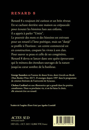 Renard 8 a toujours été curieux et un brin rêveur. En se cachant derrière une maison au crépuscule pour écouter les histoires lues aux enfants, il a appris à parler "Umin". Le pouvoir des mots et des histoires est enivrant pour un renard à l'âme poétique, mais un "danjé" se profile à l'horizon : un centre commercial est en construction, coupant les vivres à son clan. Pour sauver sa peau et celle de ses congénères, Renard 8 devra se lancer dans une quête éprouvante qui le mènera des étendues sauvages de la nature jusqu'au coeur sombre de la banlieue. * "L'Amérique n'a pas produit de satiriste aussi drôle depuis Twain." Zadie Smith