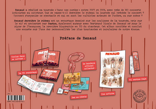 Renaud, qui fête ses 50 ans de carrière en 2025, a réalisé sa tournée « Dans mes cordes » entre 2023 et 2024, avec près de 150 concerts intimistes au compteur. Que se passe-t-il derrière le rideau la journée qui précède le concert ? Comment s’organise ce spectacle et qui en sont les multiples acteurs de l’ombre, ou sur scène ? Renaud derrière le rideau est un reportage dessiné sur les coulisses de la tournée, pris sur le vif et orchestré par Gaston, également auteur avec Bertrand Dicale de Renaud né sous le signe de l’hexagone, la première biographie en BD du chanteur. Cet album, dont Renaud signe la préface, complète et conclut une enquête sur l’une des personnalités les plus touchantes et populaires de notre époque. Ce coffret collector contient la BD reportage, le bandana officiel collector, une affiche, des ex-libris et un marque-page inédits.