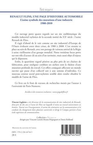 Cet ouvrage porte quatre regards sur un site emblématique du modèle industriel taylorien de la seconde moitié du xxe siècle : l’usine Renault de Flins. Il s’agit d’abord de le voir comme un site industriel d’Europe de l’Ouest évoluant entre deux crises, de 1980 à 2008. C’est ensuite sa place au sein de Renault, avec son passage de vaisseau amiral de la Régie à usine vieillissante d’un groupe mondial. Notre troisième focus porte sur son rôle d’acteur clé au sein d’un territoire mais aussi objet d’enjeux qui le dépassent. Enfin, le quatrième regard pénètre au plus près de ses chaines de fabrication, pour souligner combien ses ateliers sont le théâtre d’une mutation profonde du travail. Ces effets conjugués affectent un monde ouvrier qui passe d’un collectif uni à une somme d’individus. Ce nouveau contrat social post-taylorien semble alors rendre obsolète le modèle de l’usine de Flins. Ce livre est le fruit de travaux de recherches menés par l’auteur à l’université de Paris-Nanterre.