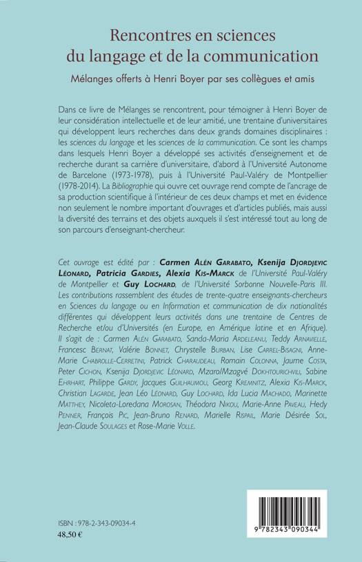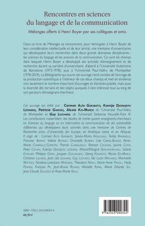 Dans ce livre de Mélanges se rencontrent, pour témoigner à Henri Boyer de leur considération intellectuelle et de leur amitié, une trentaine d'universitaires qui développent leurs recherches dans deux grands domaines disciplinaires : les sciences du langage et les sciences de la communication. Ce sont les champs dans lesquels Henri Boyer a développé ses activités d'enseignement et de recherche durant sa carrière d'universitaire.