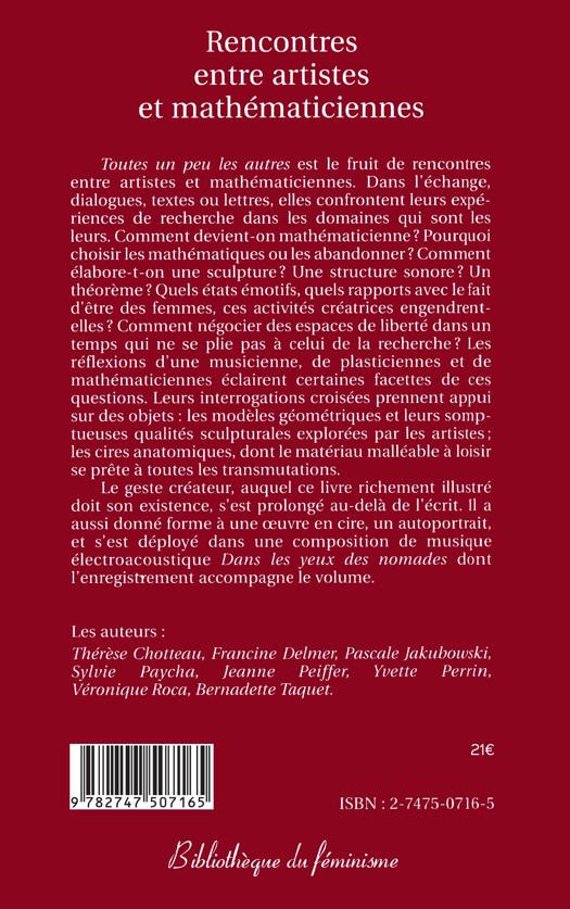 Cet ouvrage richement illustré est le fruit de rencontres entre artistes et mathématiciennes. Dans l'échange, dialogues, textes ou lettres, elles confrontent leurs expériences de recherche dans les domaines qui sont les leurs. Comment devient-on mathématicienne ? Pourquoi choisir les mathématiques ou les abandonner ? Comment élabore-t-on une sculpture Une structure sonore ? Un théorème ? Quels états émotifs, quels rapports avec le fait d'être des femmes, ces activités créatrices engendrent-elles ?