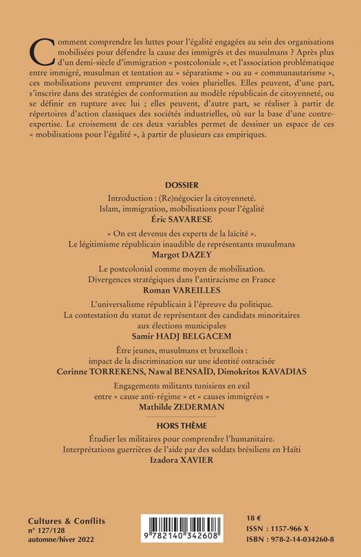 Comment comprendre les luttes pour l'égalité engagées au sein des organisations mobilisées pour défendre la cause des immigrés et des musulmans ? Après plus d'un demi-siècle d'immigration postcoloniale, et l'association problématique entre immigré, musulman et tentation au séparatisme ou au communautarisme, ces mobilisations peuvent emprunter des voies plurielles. Elles peuvent, d'une part, s'inscrire dans des stratégies de conformation au modèle républicain de citoyenneté, ou se définir en rupture avec lui; elles peuvent, d'autre part, se réaliser à partir de répertoires d'action classiques des sociétés industrielles, où sur la base d'une contre- expertise. Le croisement de ces deux variables permet de dessiner un espace de ces mobilisations pour l'égalité, à partir de plusieurs cas empiriques. DOSSIER Introduction: (Re)négocier la citoyenneté. Islam, immigration, mobilisations pour l'égalité Éric SAVARESE On est devenus des experts de la laïcité . Le légitimisme républicain inaudible de représentants musulmans Margot DAZEY Le postcolonial comme moyen de mobilisation. Divergences stratégiques dans l'antiracisme en France Roman VAREILLES L'universalisme républicain à l'épreuve du politique. La contestation du statut de représentant des candidats minoritaires aux élections municipales Samir HADJ BELGACEM Ã impact de la discrimination sur une identité ostracisée Corinne TORREKENS, Nawal BENSAÏD, Dimokritos KAVADIAS Engagements militants tunisiens en exil entre cause anti-régime et causes immigrées Mathilde ZEDERMAN HORS THÈME Étudier les militaires pour comprendre l'humanitaire. Interprétations guerrières de l'aide par des soldats brésiliens en Haïti Izadora XAVIER