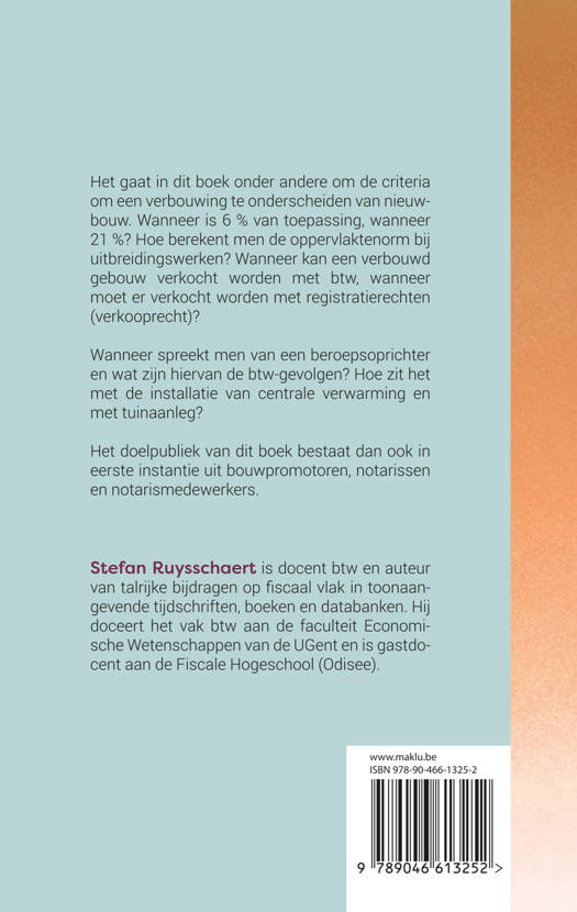 Het gaat in dit boek onder andere om de criteria om een verbouwing te onderscheiden van nieuwbouw. Wanneer is 6 % van toepassing, wanneer 21 %? Hoe berekent men de oppervlaktenorm bij uitbreidingswerken? Wanneer kan een verbouwd gebouw verkocht worden met btw, wanneer moet er verkocht worden met registratierechten (verkooprecht)?