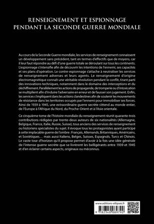 Ce cinquième tome de l’histoire mondiale du renseignement réunit quarante-trois contributions rédigées par trente-deux auteurs de six nationalités (Allemagne, Belgique, France, Italie, Russie, Suisse), tous anciens des services de renseignement ou historiens spécialistes du sujet. Il évoque tous les protagonistes ayant participé à cette implacable guerre de l’ombre : Français, Allemands, Britanniques, Américains, et Soviétiques… mais aussi Italiens, Belges, Suisses, Espagnols, Turcs et Chinois. Le vaste tour d’horizon qu’il propose permet d’avoir à la fois une idée générale de l’intense guerre secrète que se livrèrent les belligérants entre 1939 et 1945 et d’en éclairer certains aspects, originaux ou méconnus.
