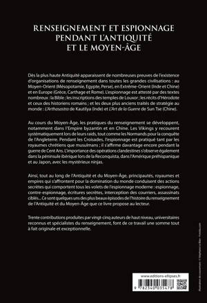 Ainsi, tout au long de l’Antiquité et du Moyen Âge, principautés, royaumes et empires qui s’affrontent pour la domination du monde conduisent des actions secrètes qui comportent tous les volets de l’espionnage moderne : espionnage, contre-espionnage, écritures secrètes, interception des courriers, assassinats ciblés... Ce sont quelques uns des plus beaux épisodes de l’histoire du renseignement de l’Antiquité et du Moyen Âge que ce livrepropose au lecteur.